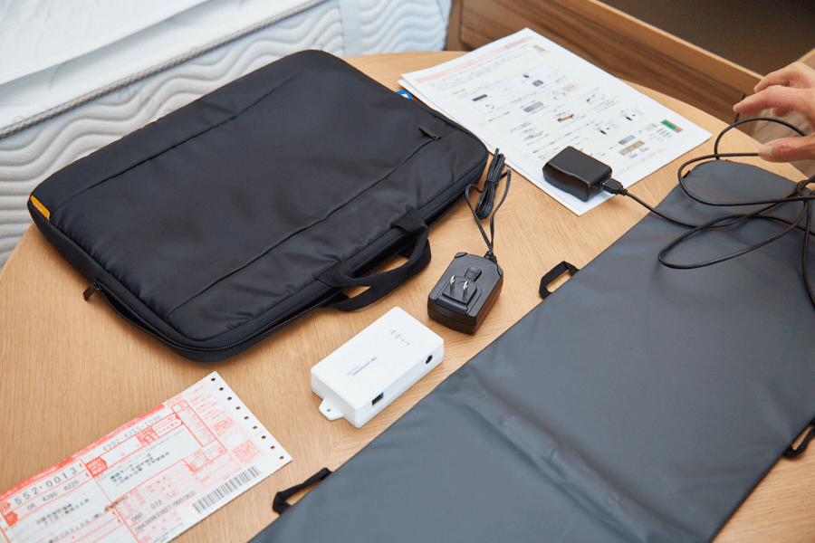 「NTT PARAVITA」から届いた機材はこれだけ。マットの下に敷いてネット環境に繋げば、セッティング完了。