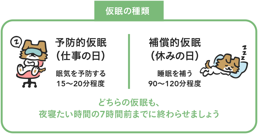 睡眠時間がちょっと足りない時には、仮眠でプラスして。仮眠も前倒しすれば大丈夫ですから。