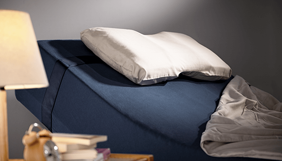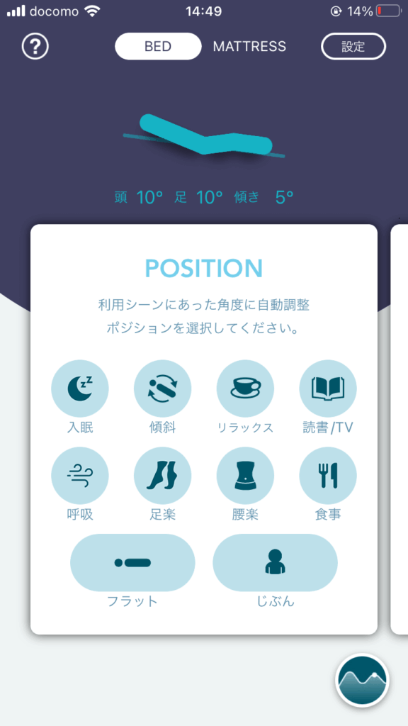 Active Sleep BEDの特徴のひとつなんですが、ベッド自体が傾斜して、足先を下げた姿勢がとれるんです。