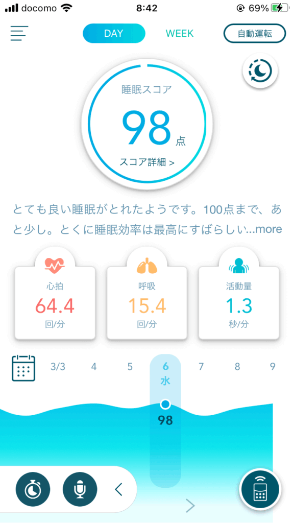 専用のアプリ「Active Sleep App」はANALYZERが感知した呼吸や心拍、体動を分析して、その日の眠りを採点してくれるんです。