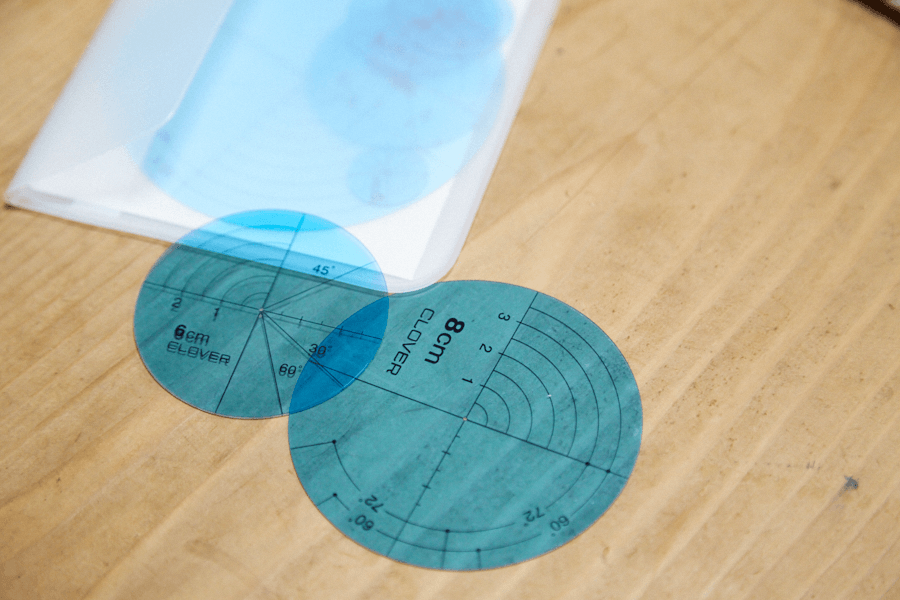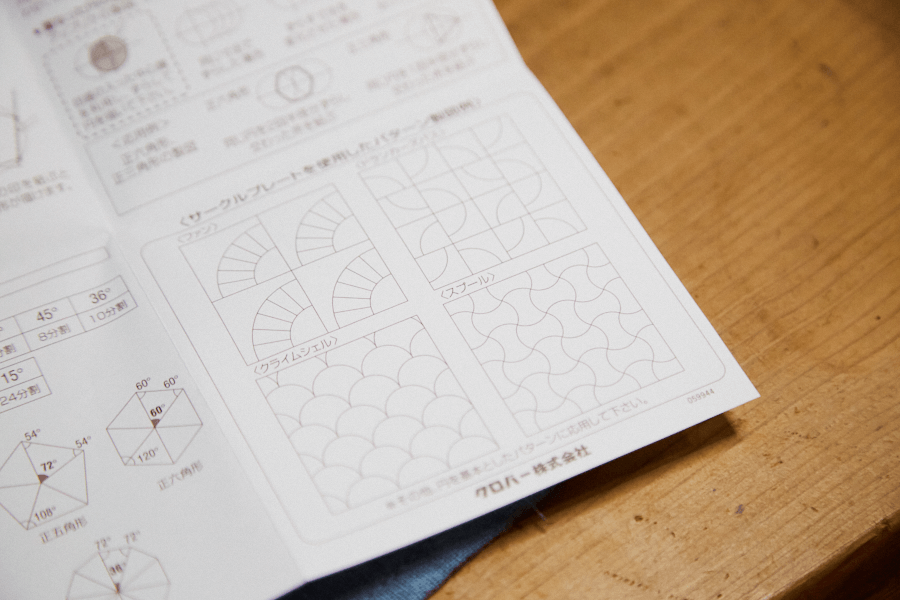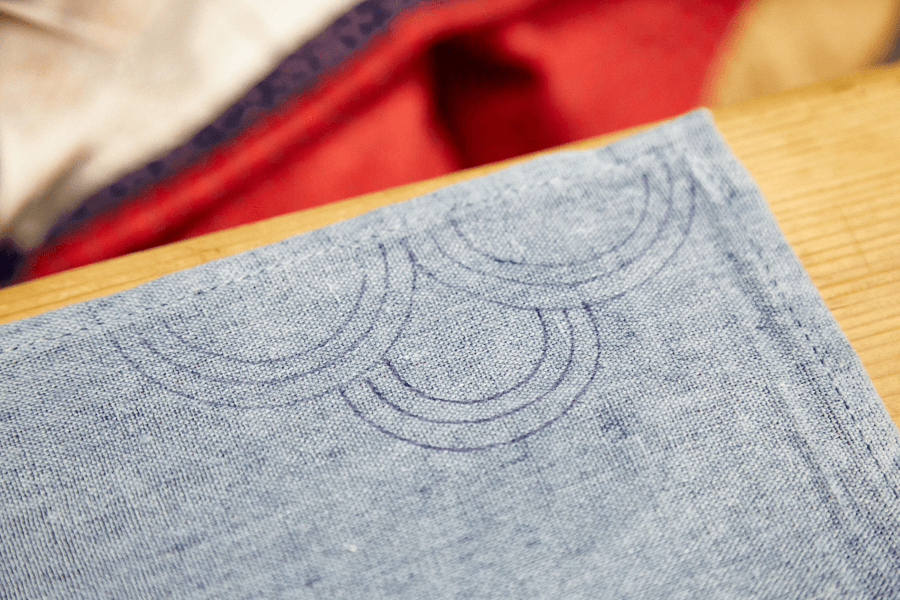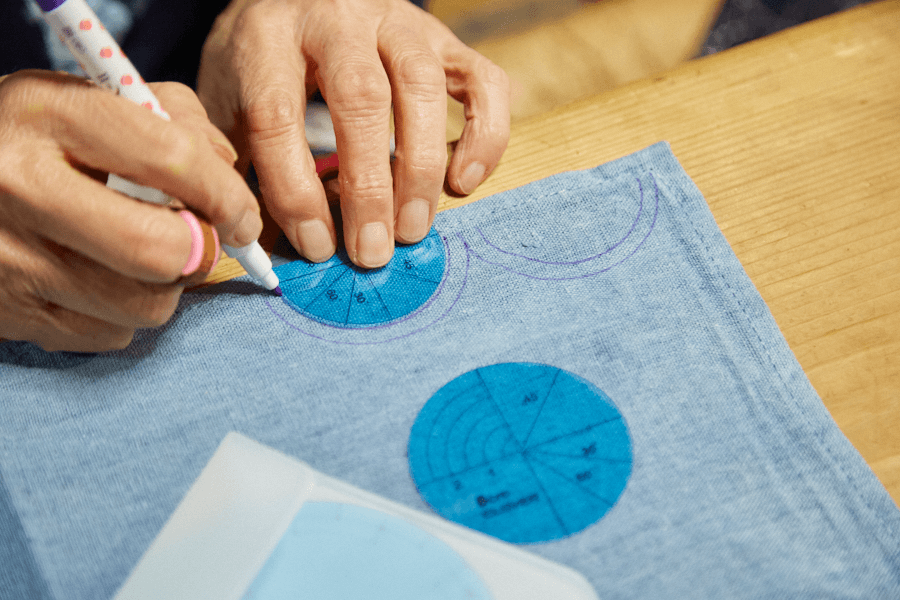まず、サークルプレートという円形のテンプレートを使って、チャコペンで模様を描いていきます。入れているのは、刺し子の伝統模様のひとつ、「青海波」という波のうねりをかたどった模様です。