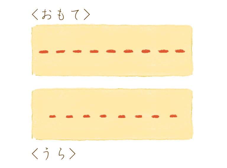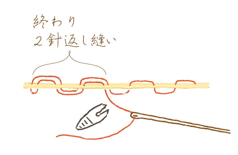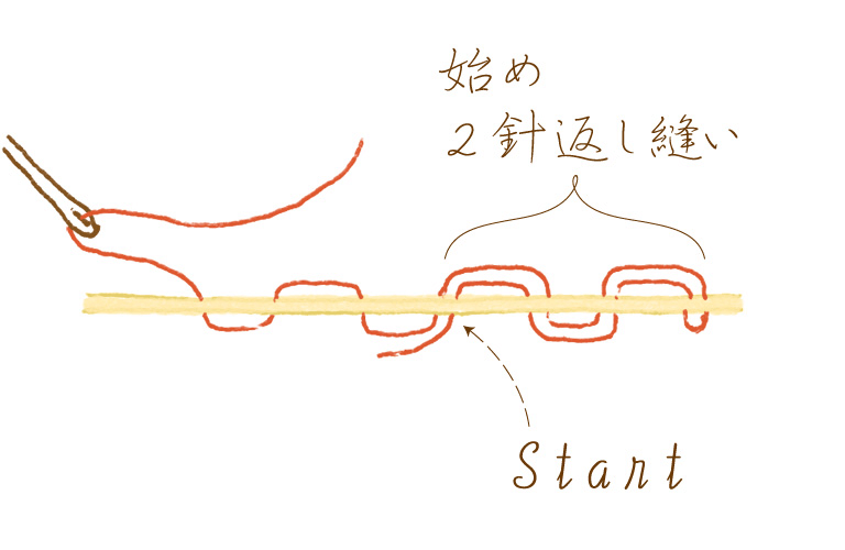 糸は玉止めをせず2針先の裏側から針を入れ、2針戻って縫い始める(返し縫い)。